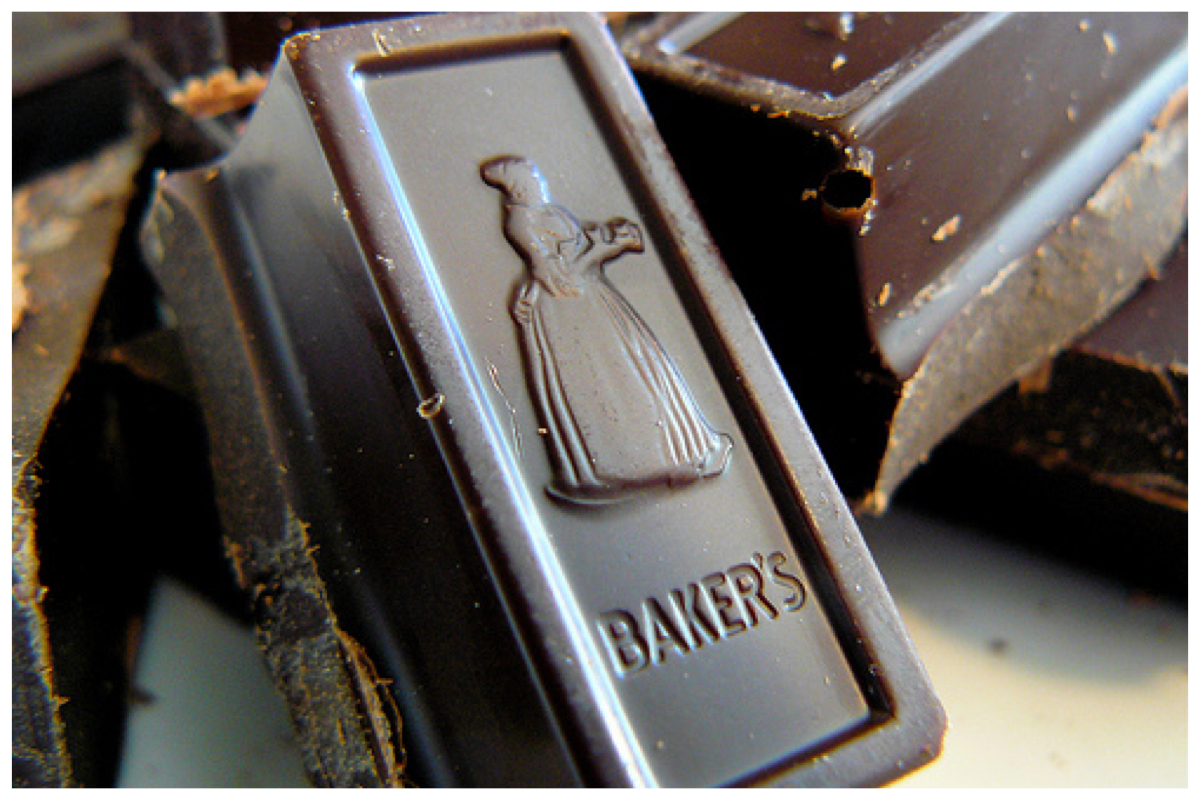 Regular chocolate comes typically in chocolate chip form and it is sweetened with sugar. It is generally made from moderate quality cocoa beans and has very low cocoa butter content and a high viscosity (thickness when in a melted state). Generally used in baking (e.g., chocolate chip cookies, cakes, etc.), regular chocolate holds its shape and is not the best choice when molding, dipping or enrobing. Another form of regular chocolate is unsweetened blocks or bars of baking chocolate (also called plain chocolate), which generally has a relatively low cocoa butter content and doesn’t require tempering when used in normal baking applications. I use this type of chocolate for general baking and it is a decent (i.e., cost-effective) choice for chocolate cakes or cookies. Baker’s Chocolate is a popular brand in this category and is widely available in North American supermarkets.