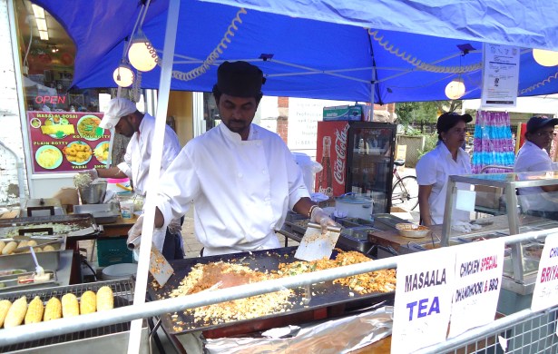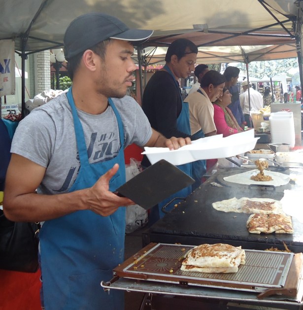 Needless to say, I went to the Festival with an empty stomach so my taste buds were yearning for something exotic. Instead of writing about every little thing I ate, here are some of my favorite eats. Avoiding all of the vendors with long lines (I like instant gratification), I waltzed my way towards a vendor making awfully huge amount of chopping sound. Not surprisingly it was Kottu Roti. You’ll know when Kottu Roti is being made because of the noise – the ingredients are usually simultaneously chopped on a hot griddle using a large pair of meat cleavers, producing a noisy sound.